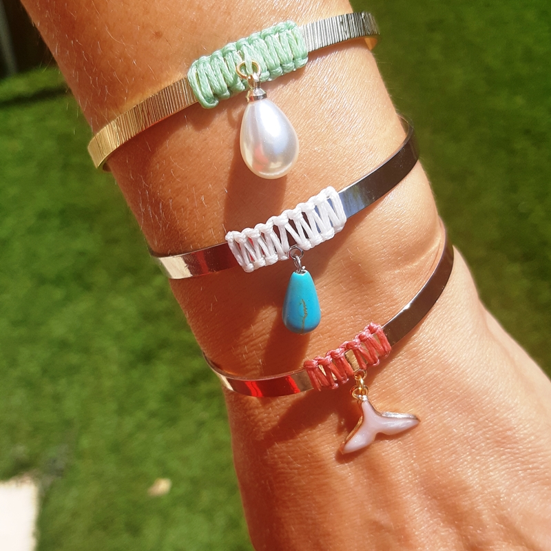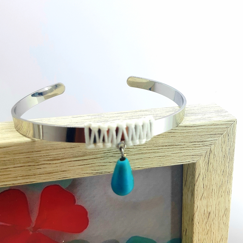 Λεπτό βραχιόλι (5χιλ) από υποαλλεργικό ορείχαλκο επιμεταλλωμένο, σε ασημί χρώμα, με μακραμέ λεπτομέρειες και μπλε Χαολίτη.