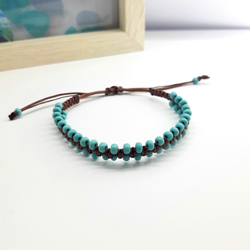 Χειροποίητο μακραμέ βραχιόλι με τιρκουάζ χάντρες και κηροκλωστή σε καφέ σκούρο χρώμα.