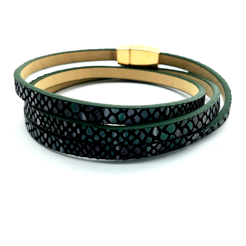 Χειροποίητο πολλαπλό βραχιόλι από δερματίνη, σε πράσινες αποχρώσεις, με μαγνητικό κούμπωμα.