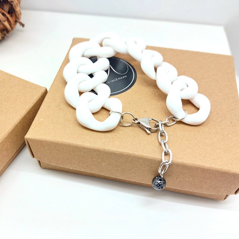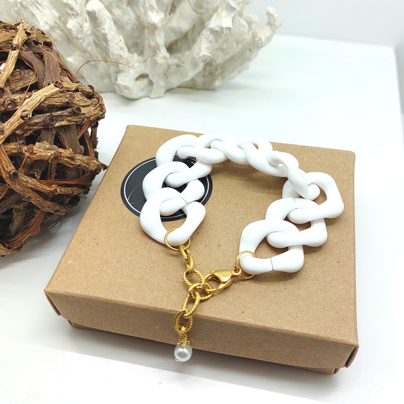 Bracelet with white acrylic chunky chain and gold or silver color stainless steel chain.